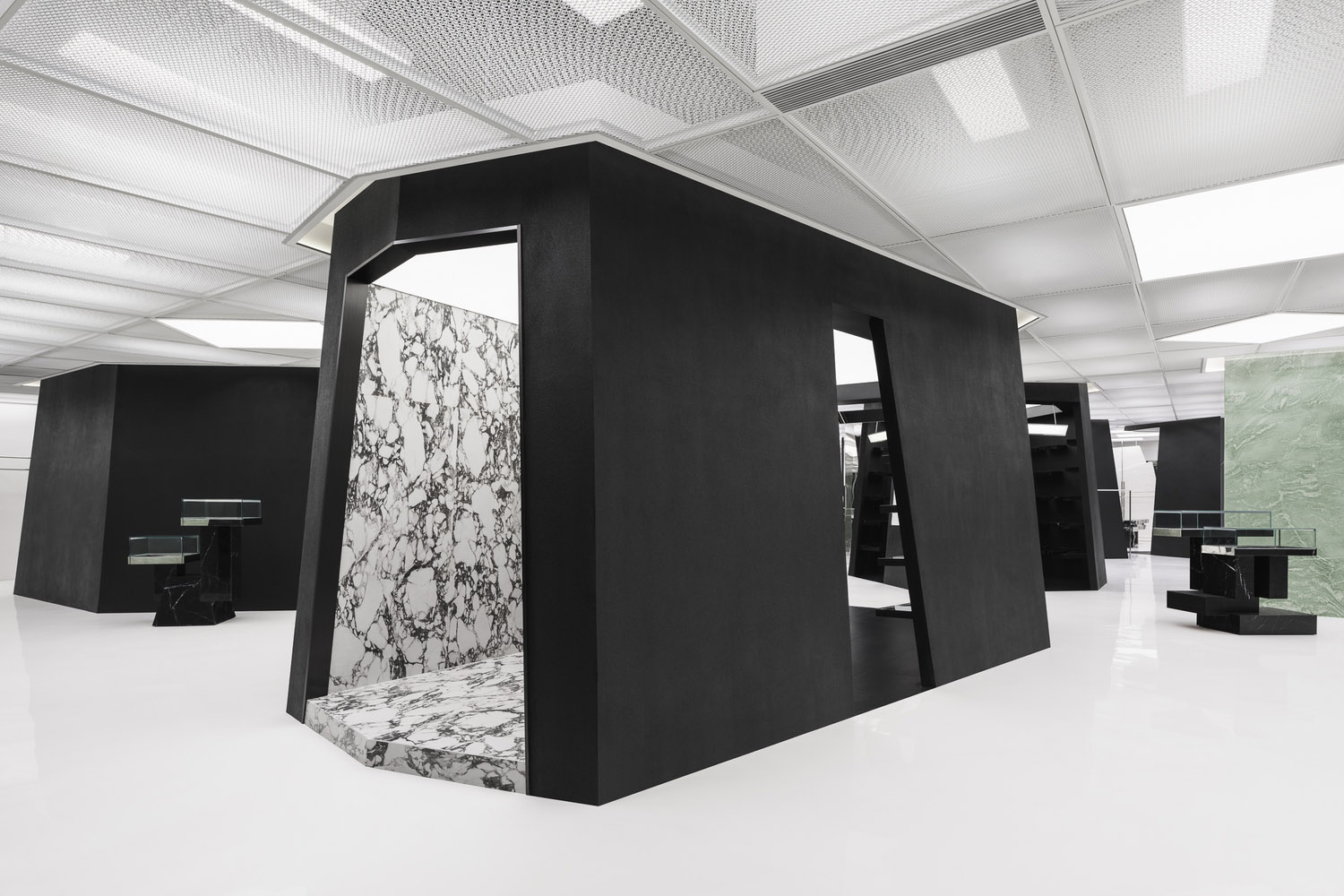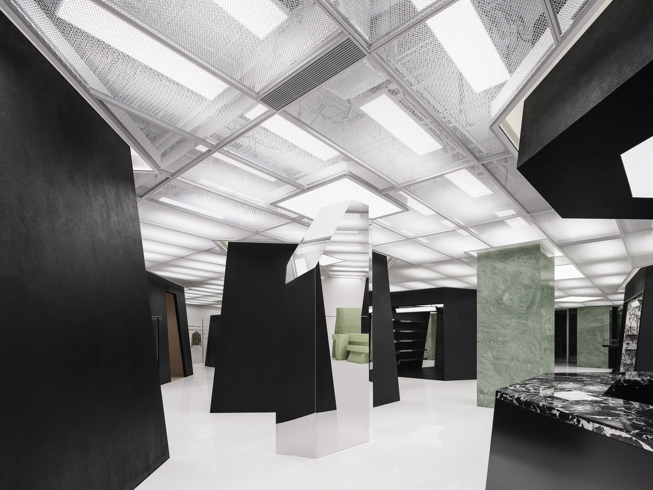 “基石”概念将空间抽象为支撑的地下根基,如嶙峋巨石般的店铺林立。中央区域的五根立柱被绿色大理石包裹,宛如巨石中迸发的结晶体,赋予空间稳固而蓬勃的生命力。建筑如巨型地下岩层拔地而起,错落生长的几何体块化身嶙峋洞窟。这场空间实验既暗合了广州塔直指苍穹的力学叙事,又以极简主义手法消解商业空间的程式化表达,让每间店中店成为支撑城市想象的未来化石。