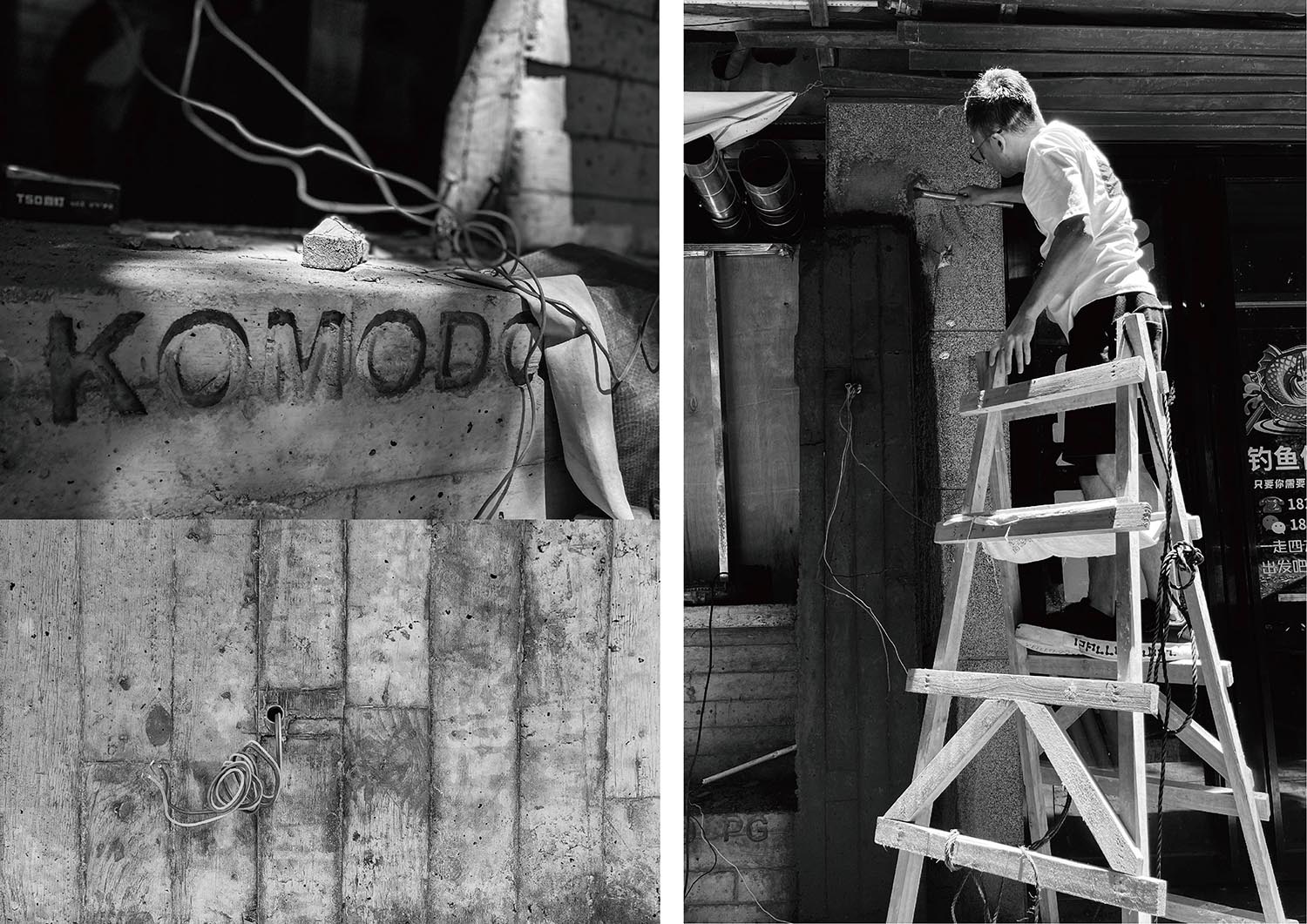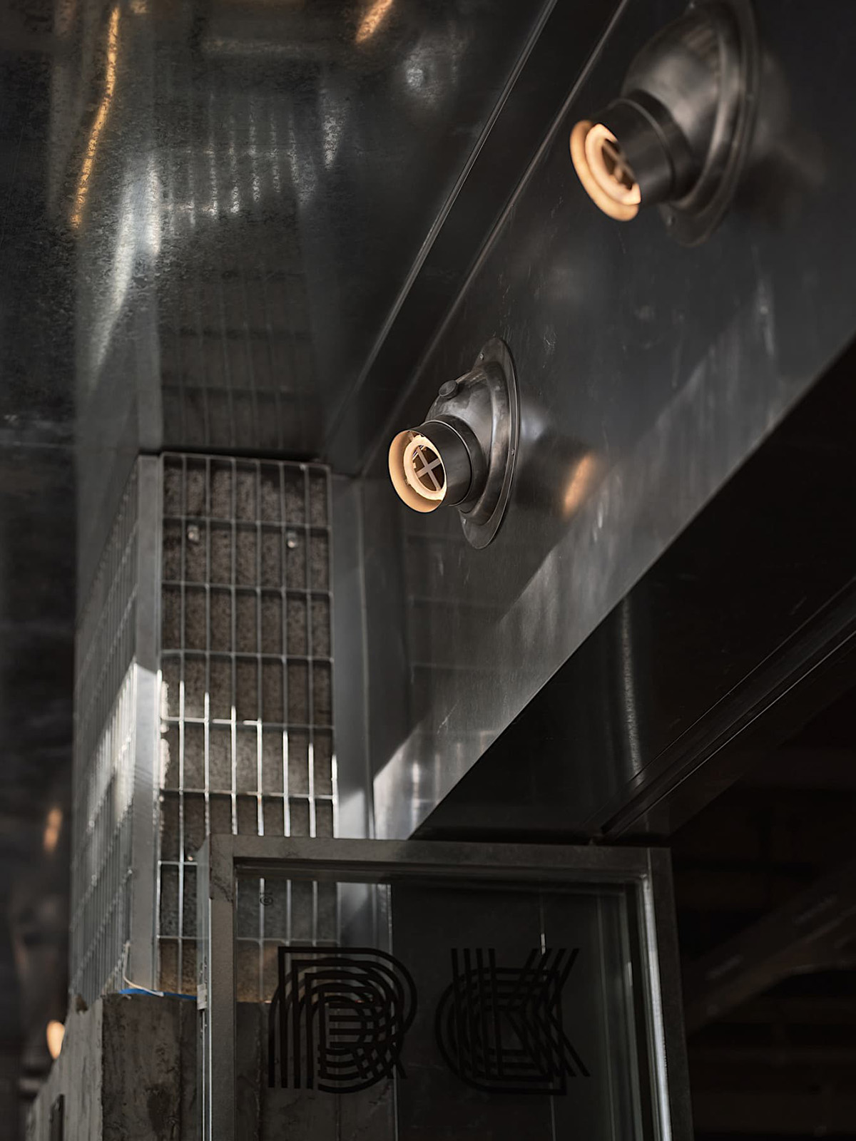 在原商铺外立面本身不能拆改的情况下,几根立柱用钢格栅网做打底,再面覆清水混凝土做不规则的浇筑。斑驳且粗粝的肌理,边缘用锤子手凿出不同的形状。
