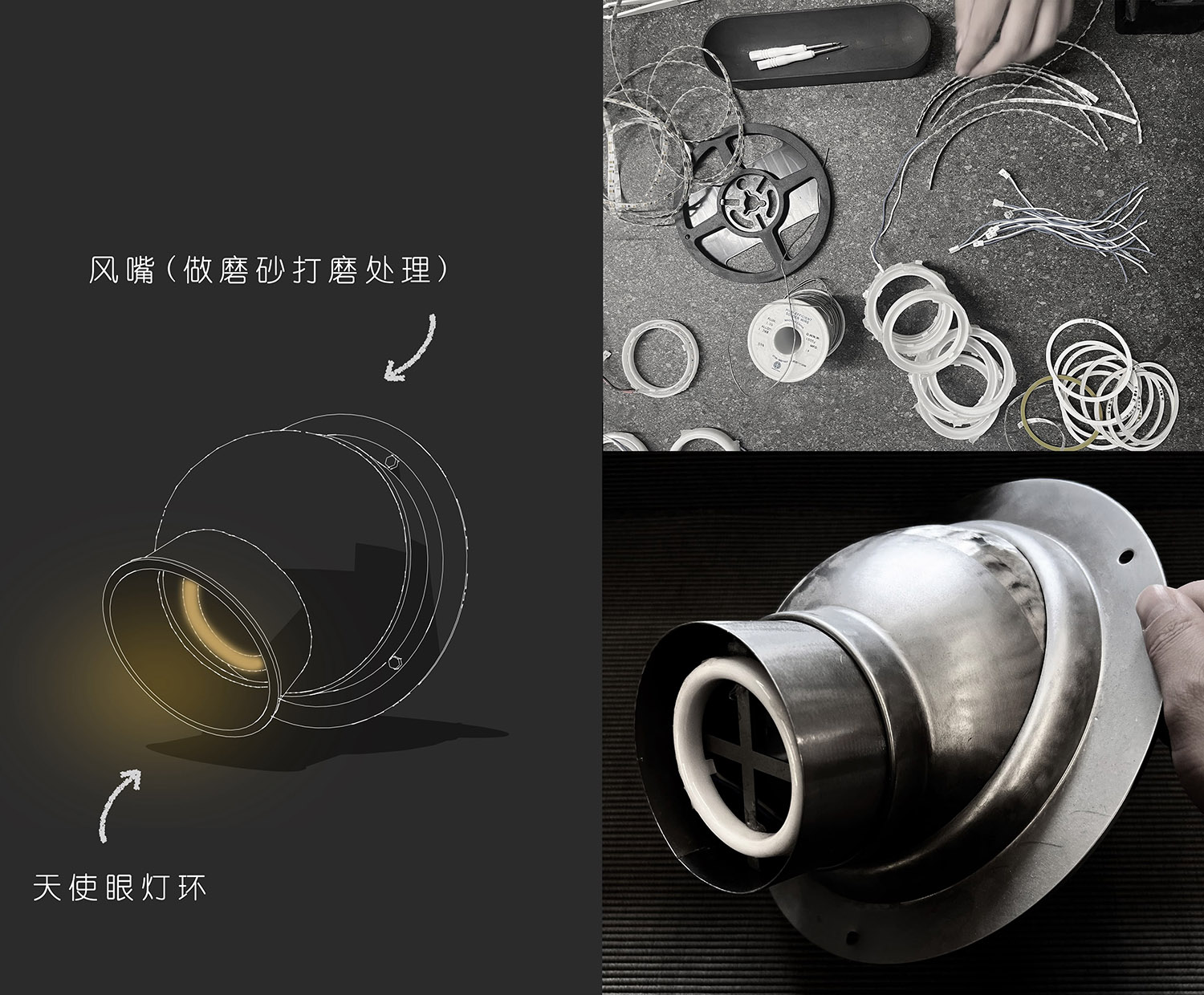 金属板翻折而成的”船体“上有风口造型做灯眼,由成品风帽和汽车大灯天使眼加工制成。像船舱房间里的舷窗,向外眺望。