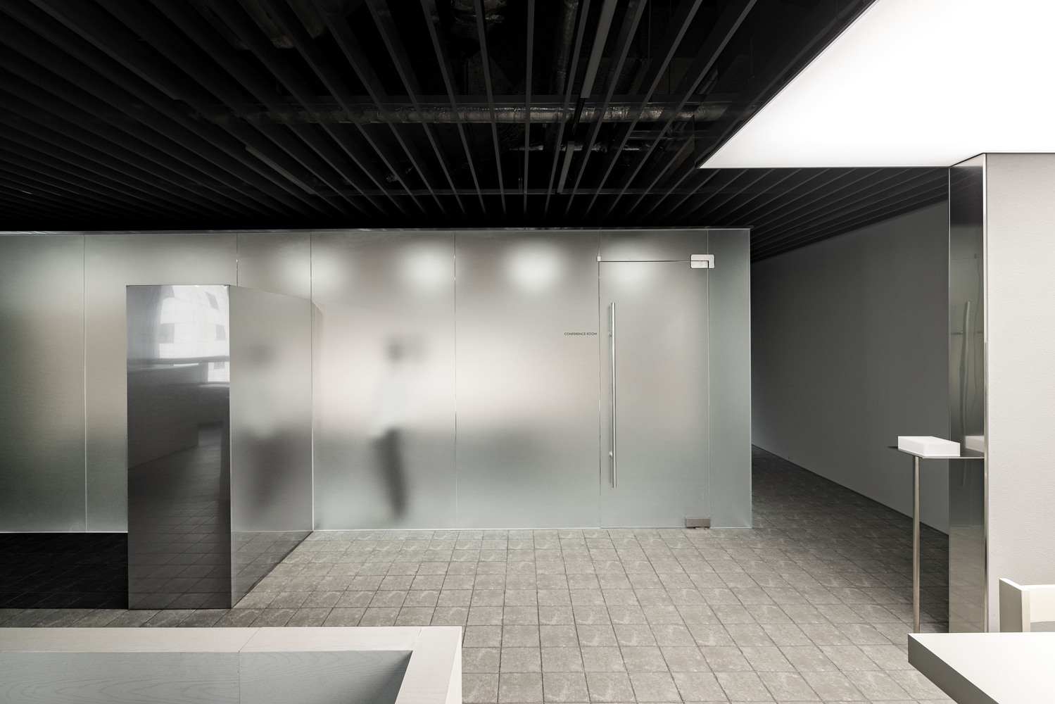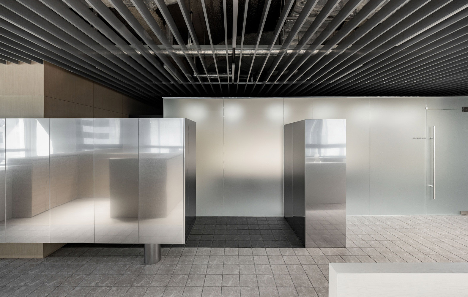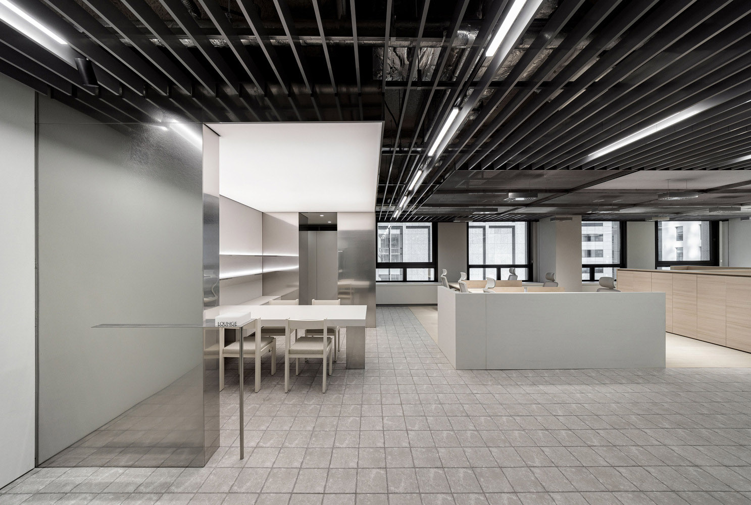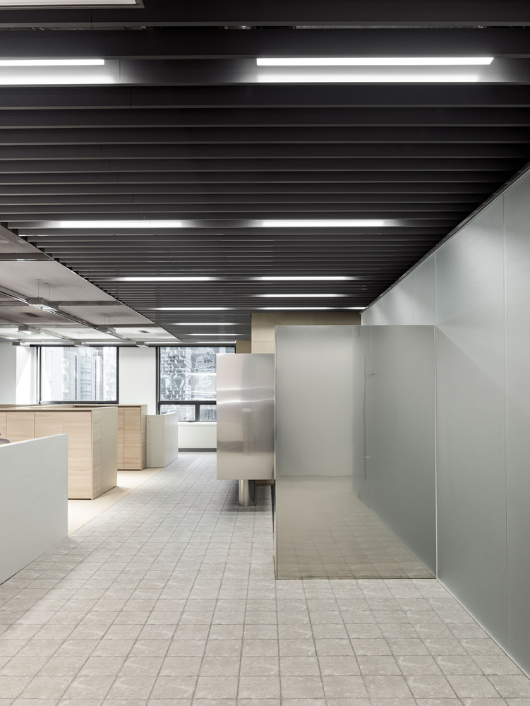 布局很简单:工作区、会议室、行政办公室、休息区和厨房。我们不想让人们仅仅沉浸在工作中,让时间不知不觉地流逝。我们希望人们在感受到阳光的温暖和时间的流逝中工作。我们将最常有人的空间安排在靠近窗户的地方,并按照自然的流动和节奏设计了会议室、办公自动化(OA)区、休息区和厨房。行政办公室和会议室位于无窗的一侧,在布局中形成了核心体块。就像森林中的树木,每一个体块都有其独特的存在,高度和饰面各不相同。通过百叶窗天花板,这些体积之间的光线像阳光透过树木的缝隙一样洒满了整个空间。