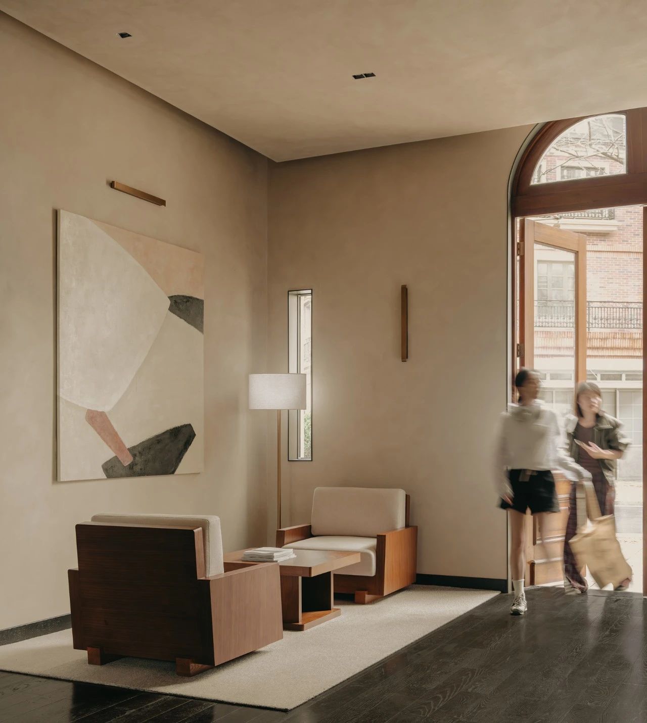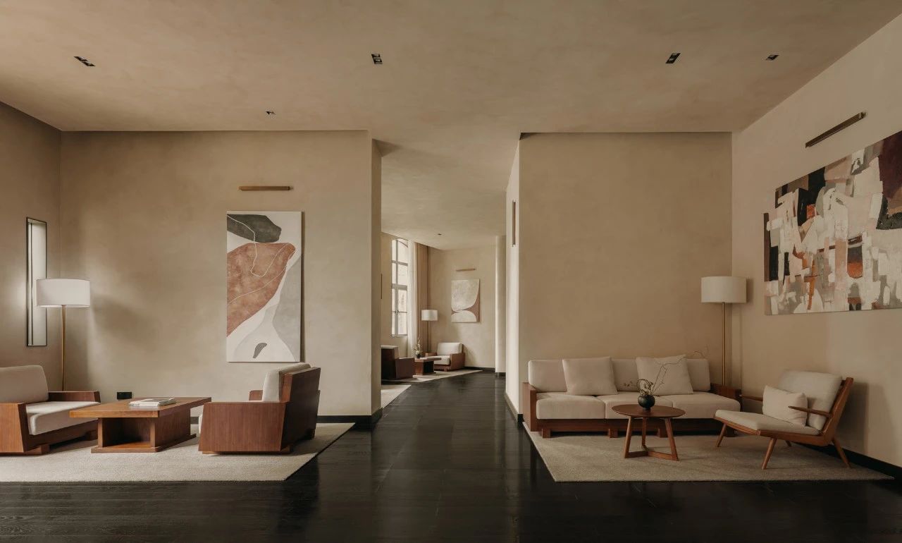 酒店所在小镇街区具有丰富业态,复杂空间,多样建筑,和充满活力的度假社区氛围。建筑原本标志性的欧式基因使得室内持留存时间的空间改造策略。设计将原有内装全面拆除,露出空间原本的朴质,保留其简洁纯粹的原始结构,延续原有布局全套房的形式。将原建筑立面的暖色调延续进室内的色彩呈现,提炼立面的凹凸窗墙元素延申到室内的凹凸触感肌理,以木质家具和特别选取的具有时间感的旧质材料,表达时间的深度。