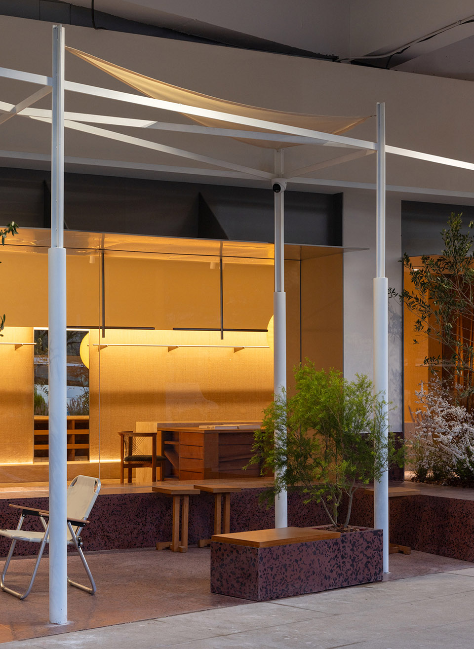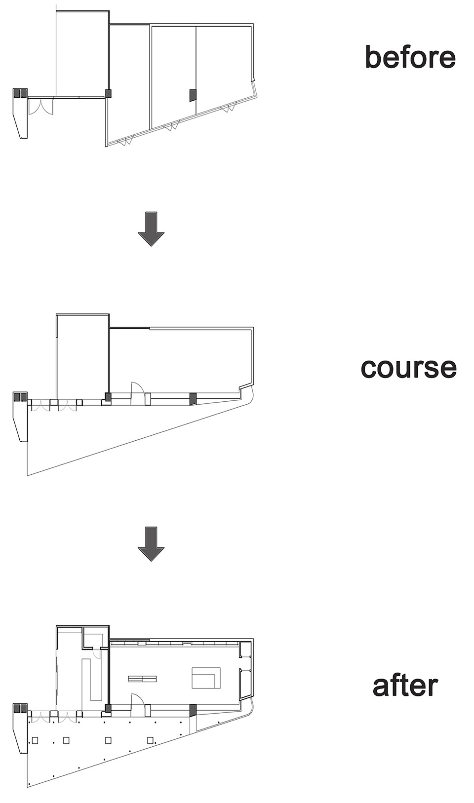原场地由一道防火墙将空间硬性分割,在不破坏消防防火墙的前提下,我们将整个场地规整为一个不等边三角形与两个长方形,三角形强化场地本身的形态,长方形作为内部使用空间。
