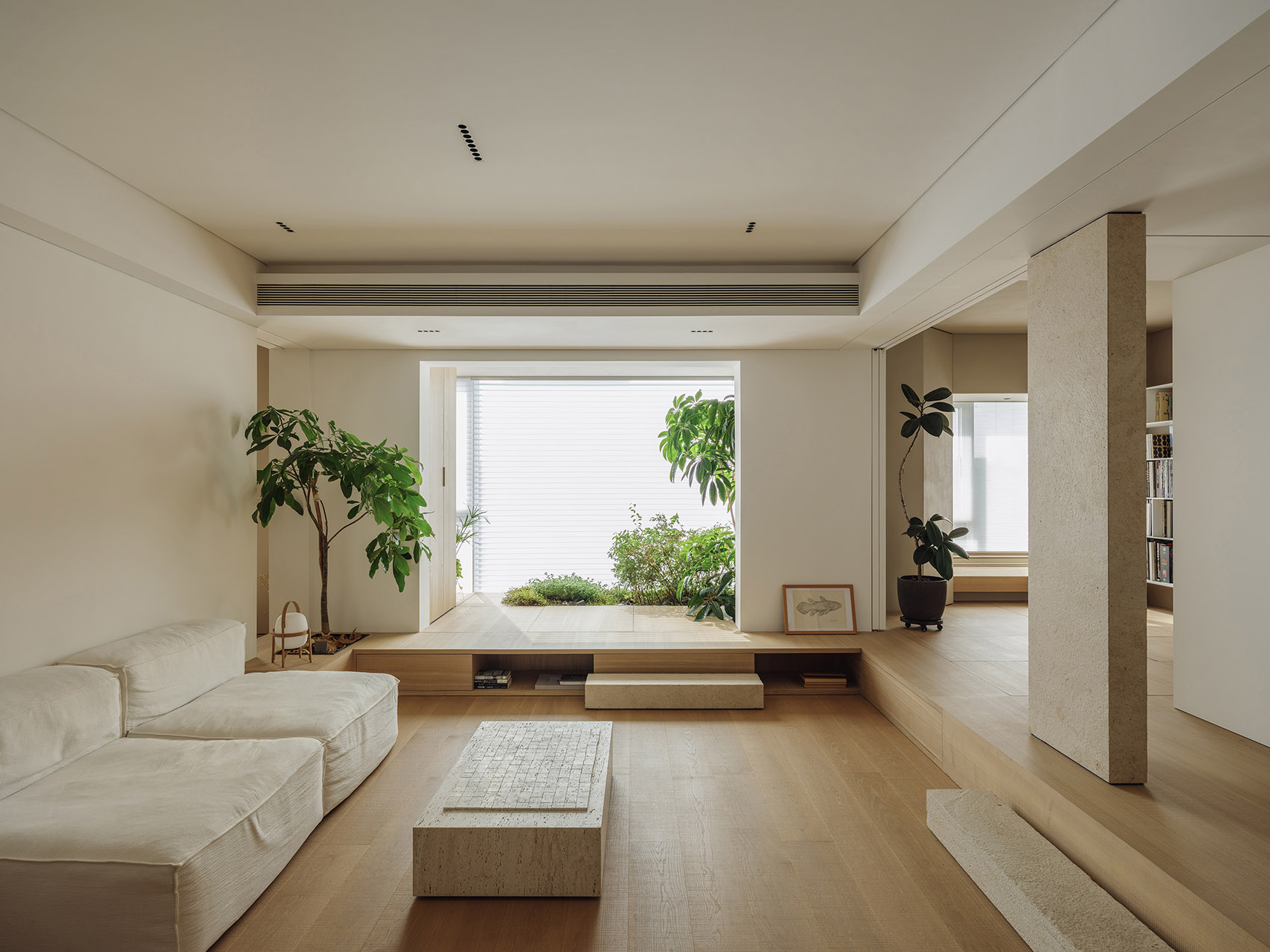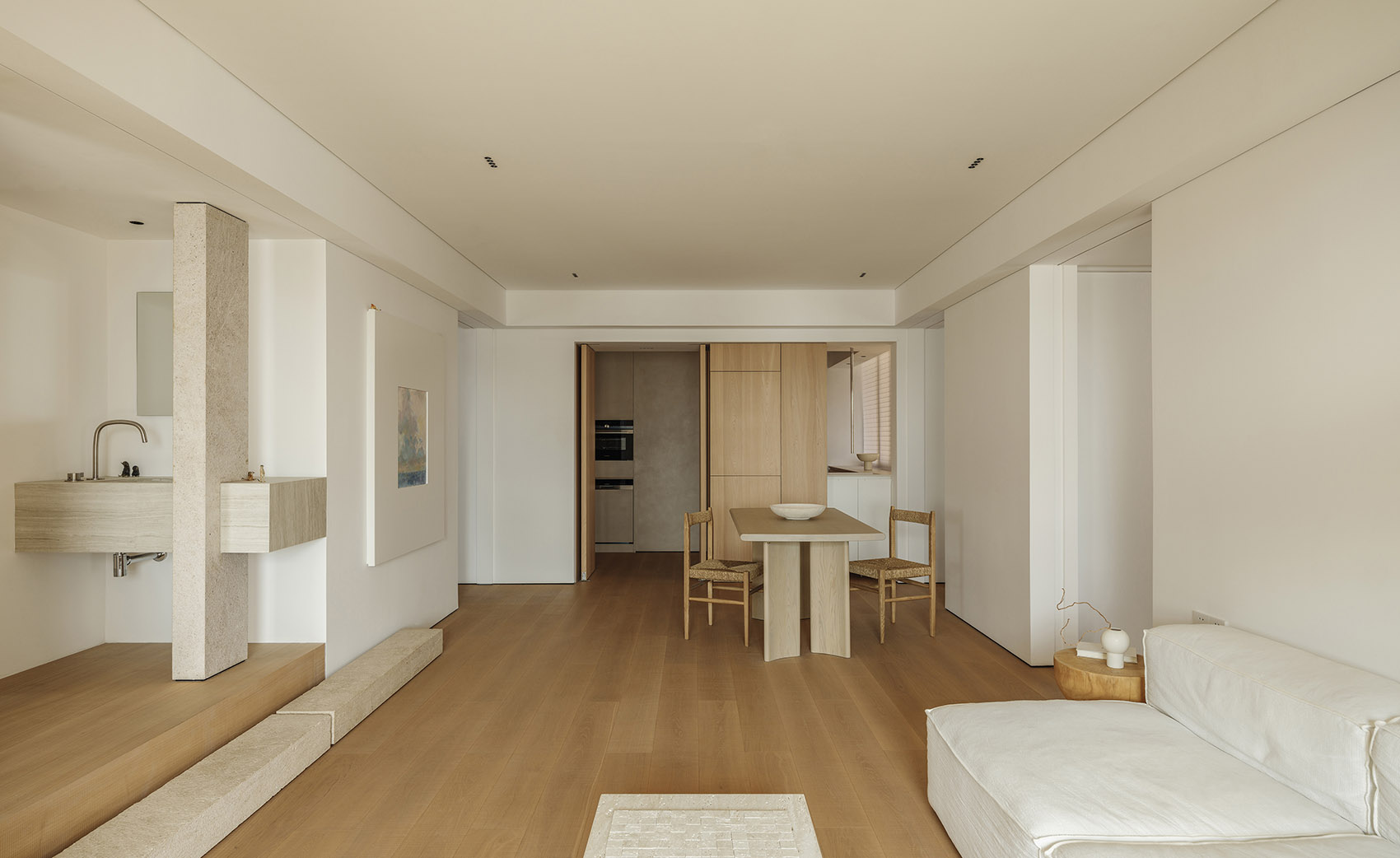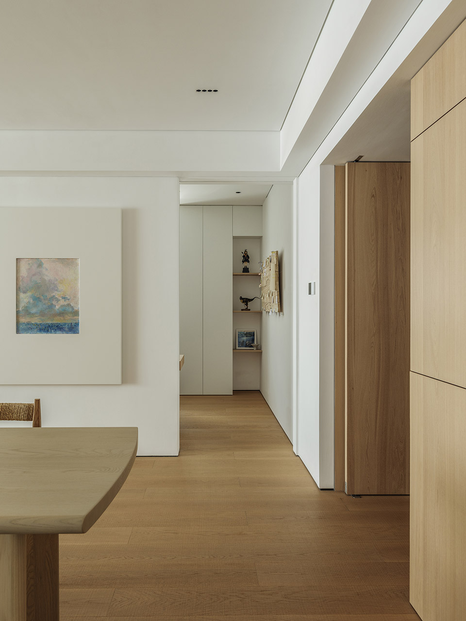 玄关,由下沉的地台,界定向室内过渡的“庭台”。半高柜体与水平横窗结合,塑造洞口视景与回转路径。水龙头以纤细形式悬落,形成静谧的入户仪式。悬挂置物、坐落脱鞋、清洁双手——从外到内,由繁至简,形成向内观照的空间自然。