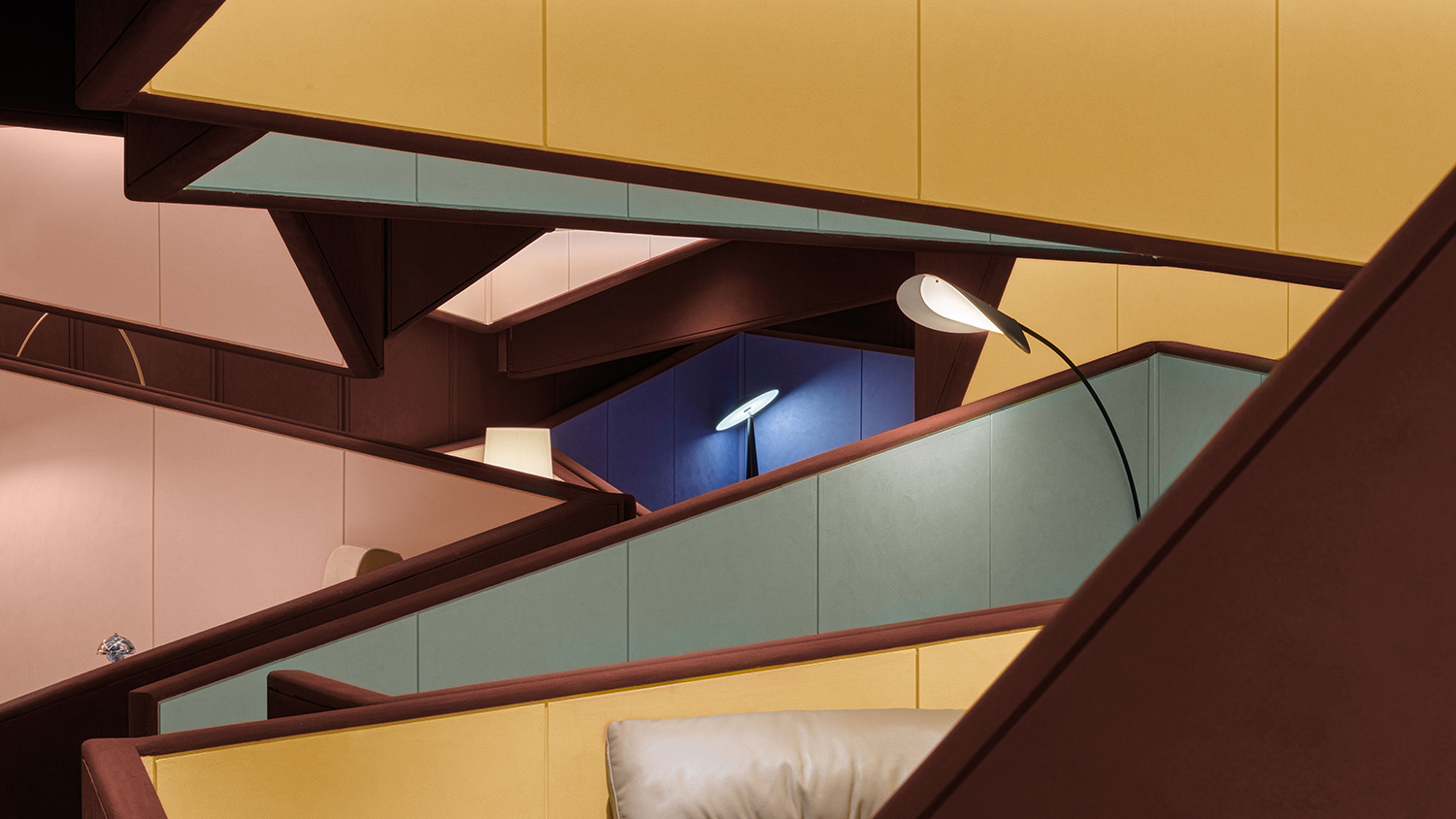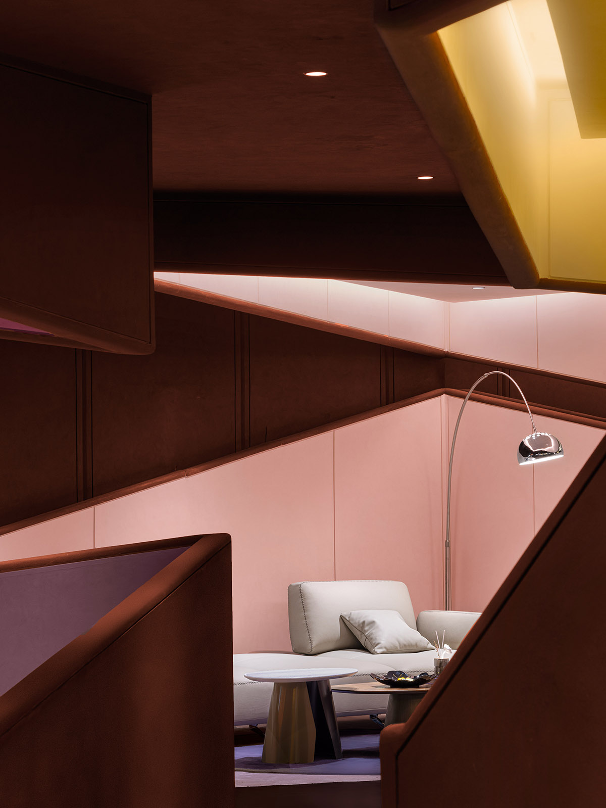 设计师从园林曲折回环的小径中提取几何线条,14套沙发展品被置入轮廓硬朗的不规则多边形“盒子”内,每一套沙发皆拥有独立的展陈空间,彼此间相映成景,又互不干扰。线条镂刻吊顶与围合式隔档,半包裹状布局演绎出一种围炉夜话的亲密磁场。小径将相互独立的展示场景化零为整、串联起来,以曲径通幽的氛围激发人们对空间的探索欲