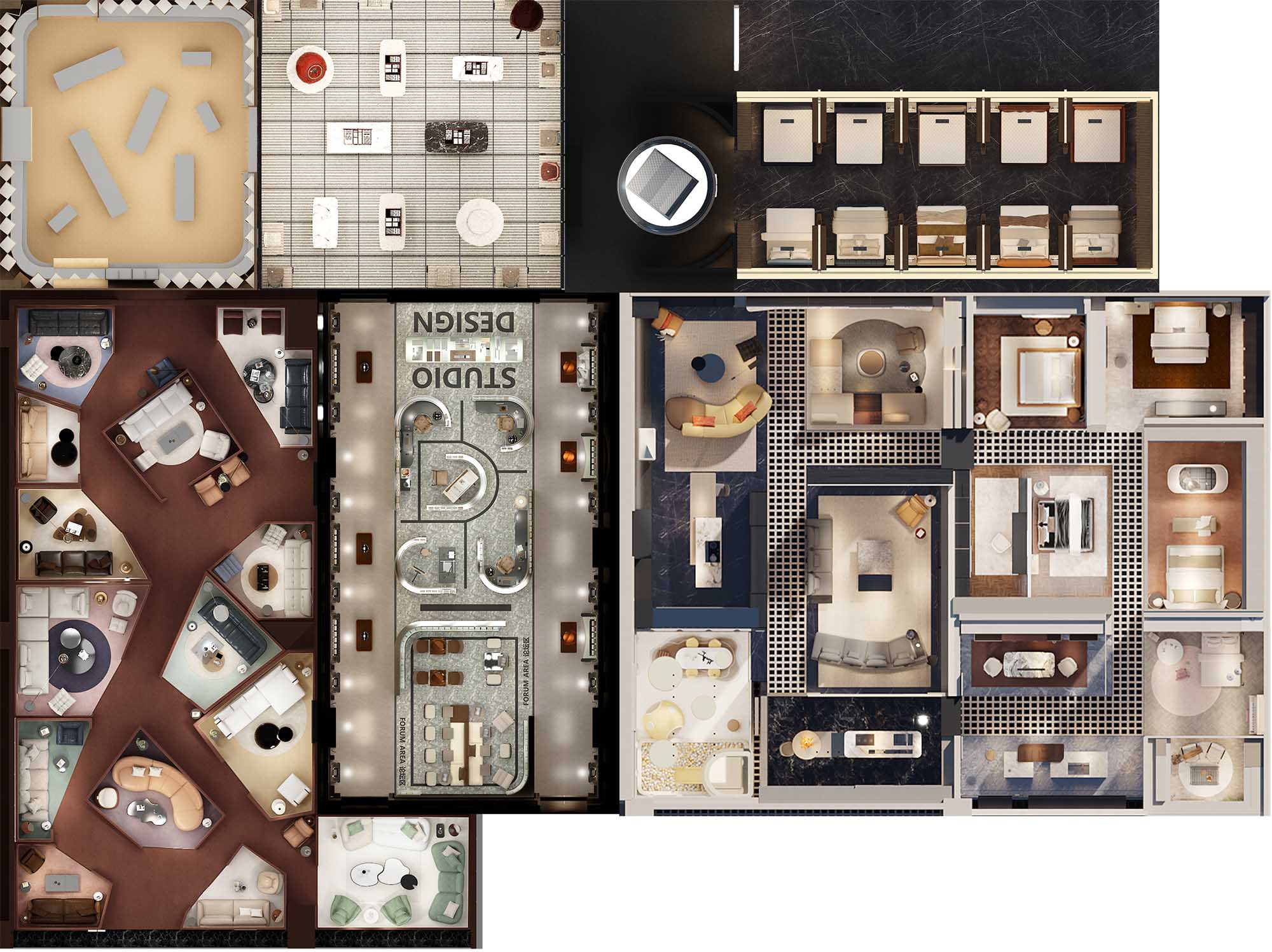 The independent display zones, classified as functional spaces, are transformed into exclusive narrative stages for products through architectural modular segmentation. The designer’s workspace, as a public space, links diverse scenarios with an open layout. Gray spaces, such as corridors, transition areas, and corners, dissolve the sense of spatial fragmentation with soft boundaries, guiding viewers to naturally perceive changes in rhythm as they move through the space.