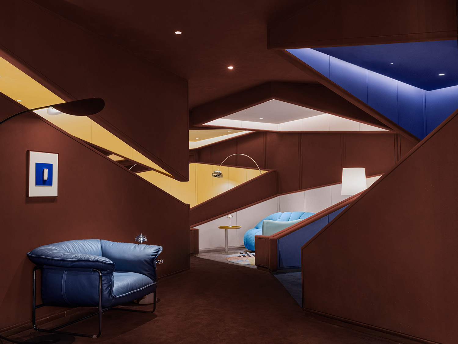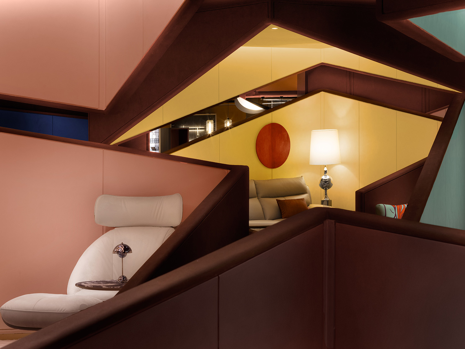 The designer extracted geometric lines from the winding paths of a garden. Fourteen sets of sofa exhibits were placed inside irregular polygonal “boxes” with sharp contours. Each set of sofas has its own independent display space. They complement each other while remaining undisturbed. The ceiling carved with lines and enclosed partitions, form a semi-enclosed layout that evokes an intimate atmosphere, reminiscent of a fireside chat. The pathways connect the independent display scenes into a cohesive whole, using the atmosphere of a meandering, secluded path to arouse people’s desire to explore the space.