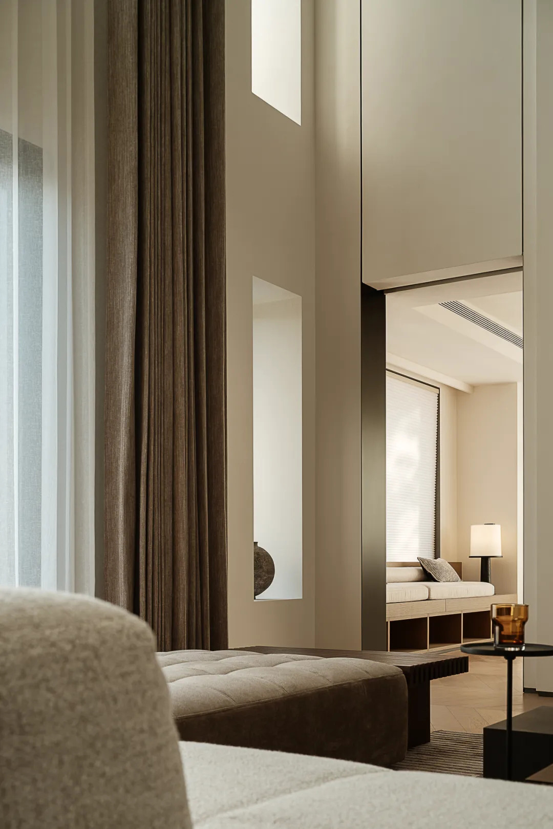 干净利落的空间构建,艺术的光影交相,承载着对自然的追求。客厅利用挑高设计将空间格局打开。直线简洁有力,向上延伸整体视觉空间,采用不同材质平滑过度空间板块之间的连接。大片玻璃立面引入更多自然光,使得整个空间跟随时光流逝呈现出不同的光影故事。