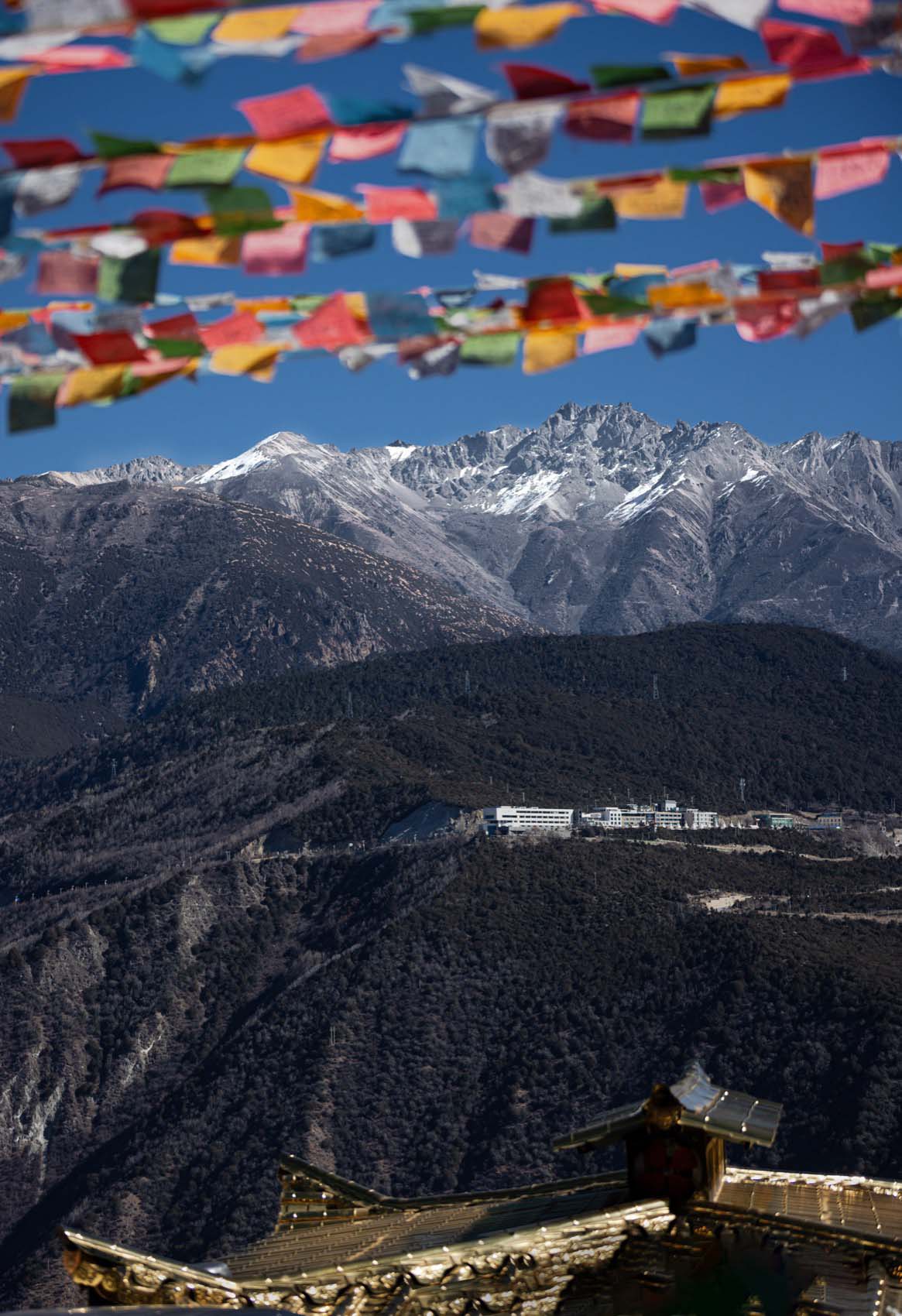 从雾浓顶望向梅里雪山,每日初升的太阳,光首先点亮卡瓦格博锋利的山尖,在短时间内将雪山渡上一层桔金色……这是当地人眼中难得一见的神圣景观,如同一场转瞬即逝的金色盛典,是获得神明护佑的吉祥之兆;这也是藏族人与卡瓦格博峰对话的纯净仪式,在此刻将个体生命与雪山连结,是藏族文化中人与自然共生的缩影。