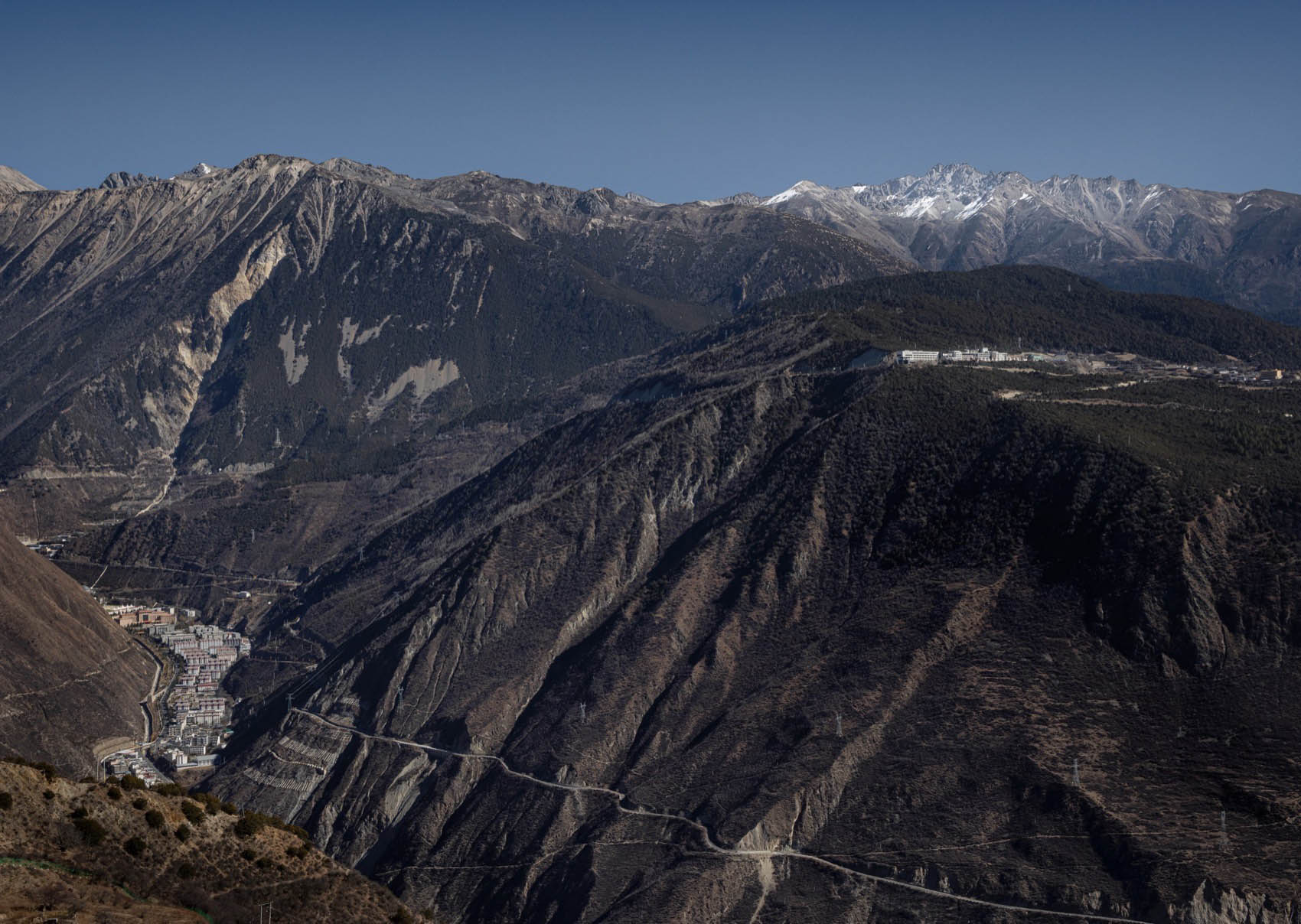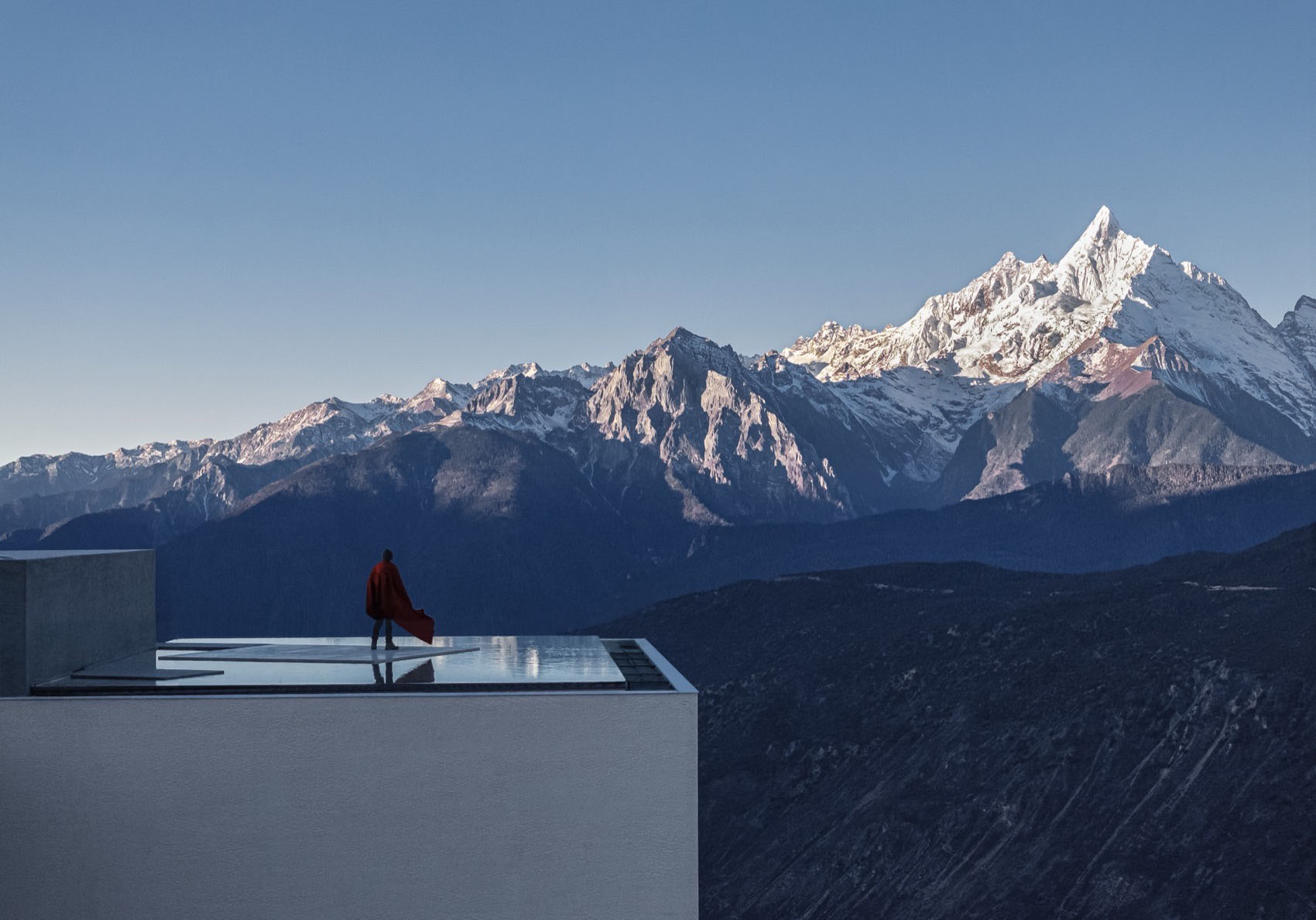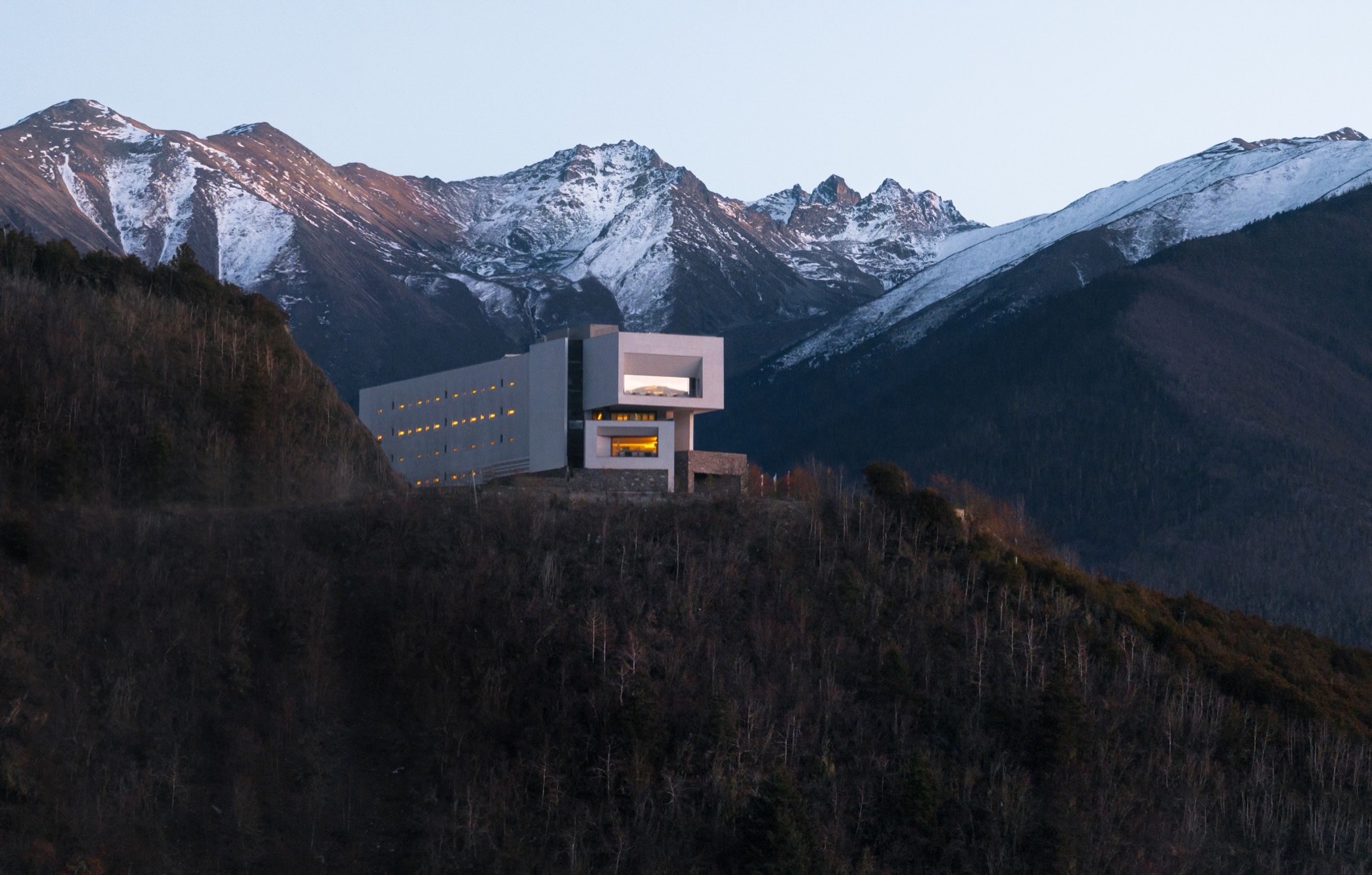 两侧环绕住雾浓顶的雪山群所带来的强烈感官冲击,让人和人造物忽而显得十分渺小;终年覆盖着皑皑白雪的崇山峻岭,天然嵌合着一种强烈而神圣的空间张力,在这样的自然环境中,任何夸张的建筑形式都会显得过于繁杂和跳脱。