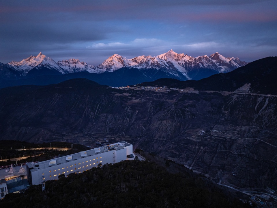 梅里泊度酒店位于梅里雪山东侧雾浓顶观景台,身处3600米的高山,直面壮丽神圣的梅里十三峰,百里的连绵长卷在远方徐徐展开;又背靠着白马雪山,被两座巍峨的雪山群环绕其间;端头一侧是高差数百米的深邃山谷,几近垂直的落入德钦县城。