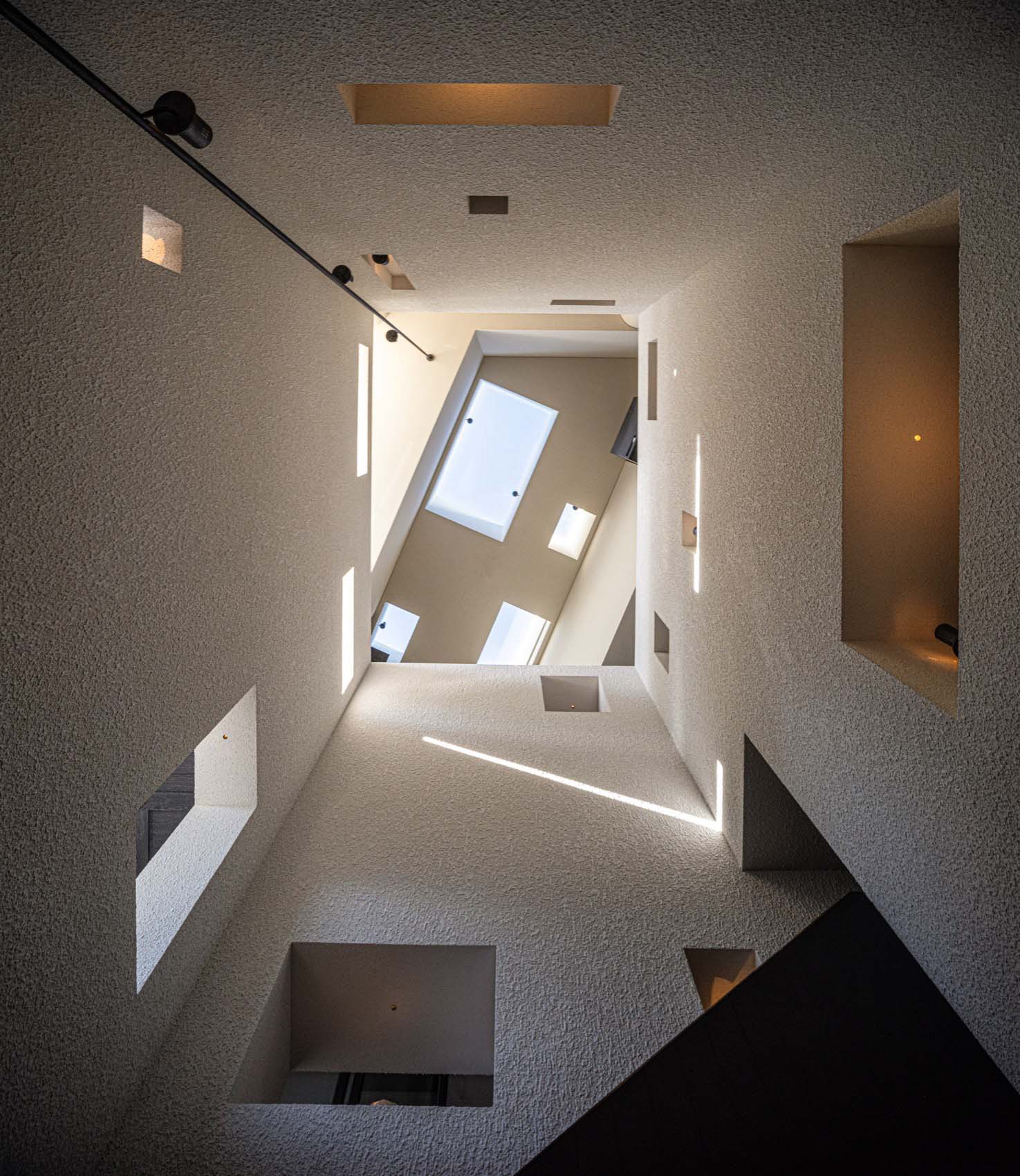 建筑以横向延展的形态呼应山脉走向,以纯净色彩与材质融入藏地语境消解对原始景观的侵扰,同时通过错层与体块扭转,串联从开放到私密的多维体验、模糊室内外界限,让建筑内部视线与光影不断交织,打造出一个聚焦空间叙事的“垂直流动园林”。