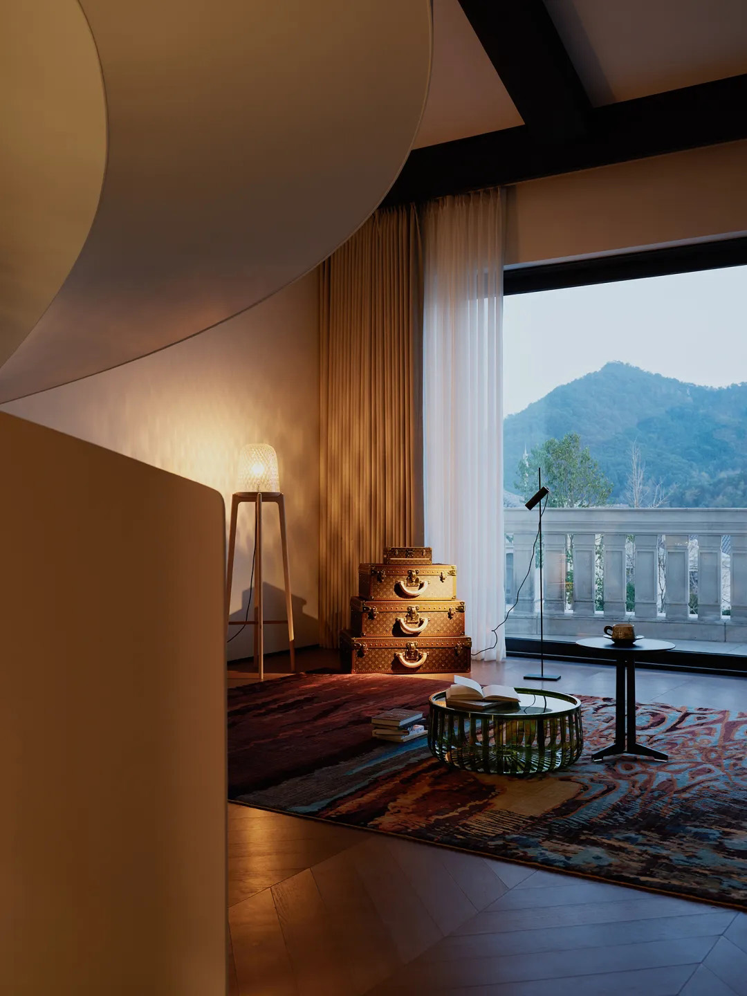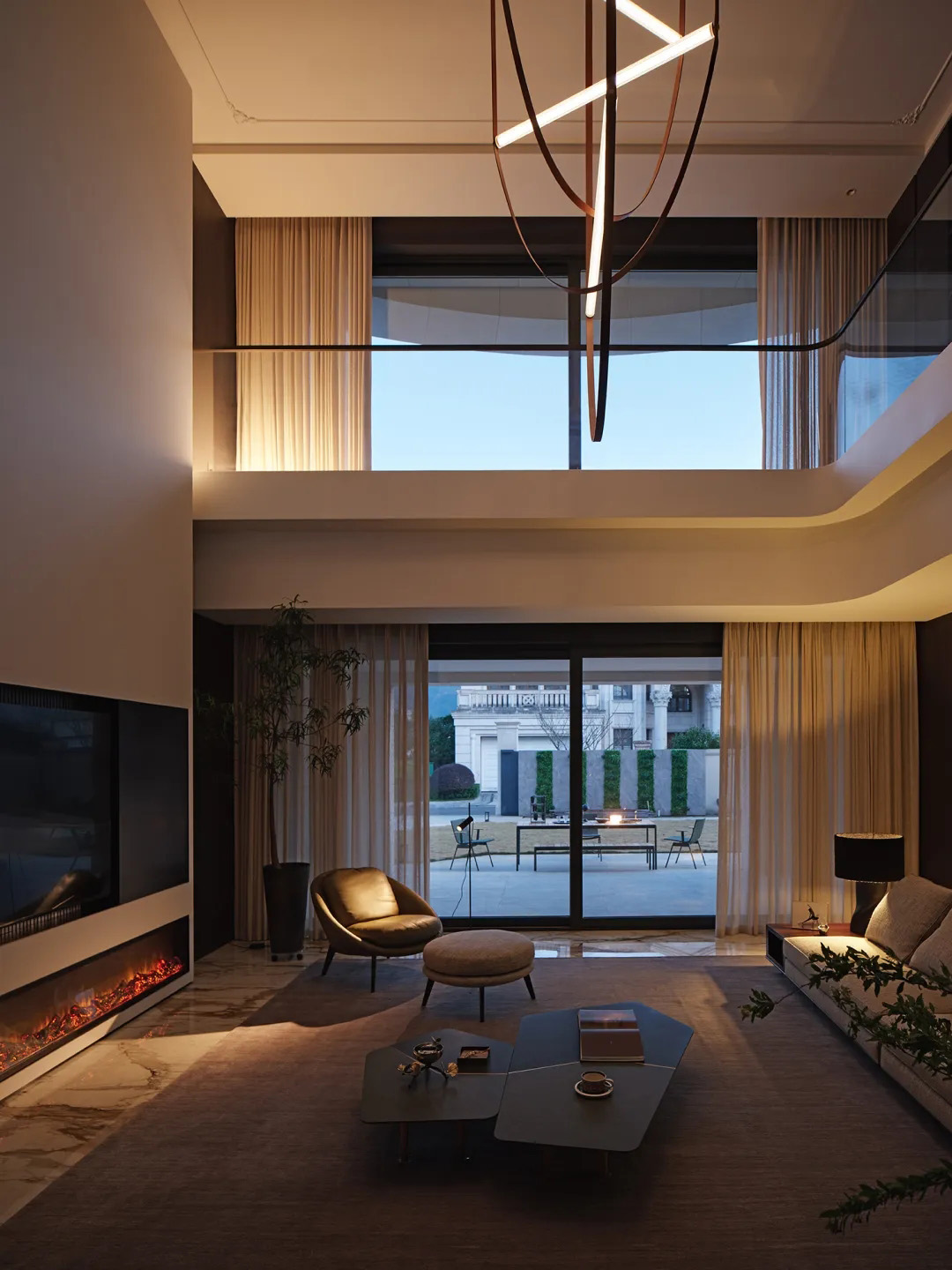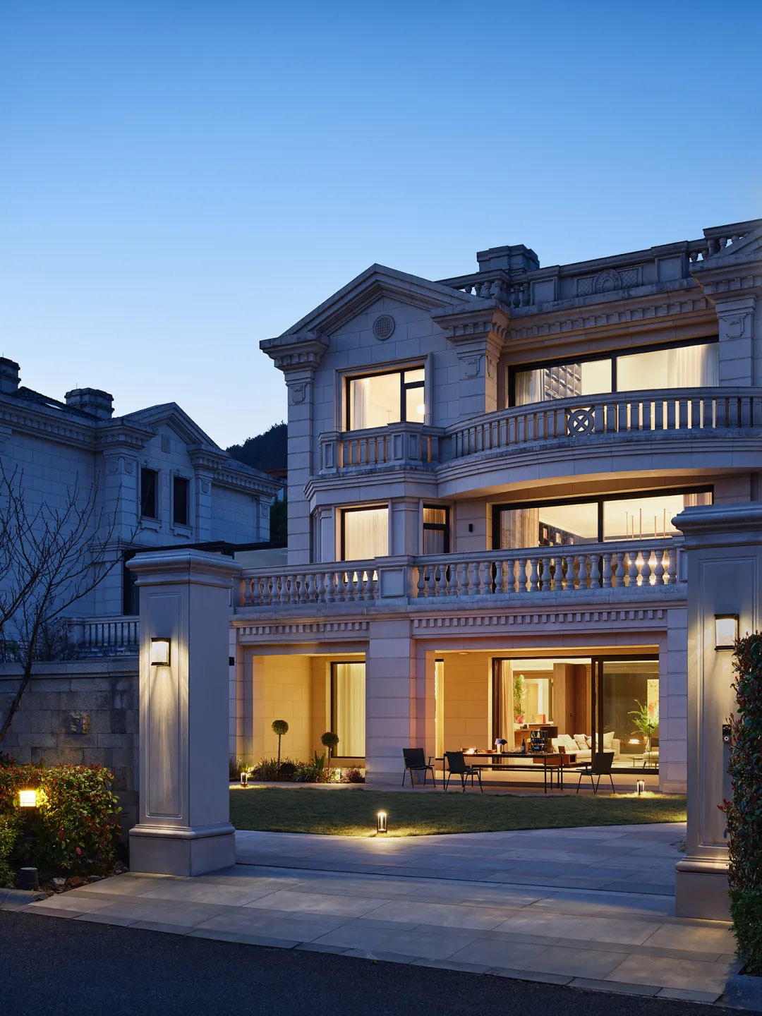 宁波东钱湖的烟波浩渺中,一栋三层法式庄园依坡地而建。建筑北侧借地势高差形成车行入户系统,南向600㎡花园如绿毯铺展,与湖山相映成趣。设计师保留并梳理了原建筑的大理石立面,仅对窗体比例微调,让法式建筑的古典线条与江南山水达成微妙平衡。坡顶阁楼的观景露台、层层退台的挑空设计,将湖岸四季晨昏化作空间的动态背景,实现“建筑从自然生长,生活向自然延伸”的栖居理想。