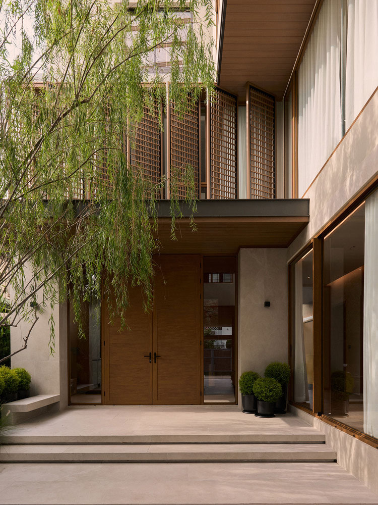 进入这座别墅的旅程开始于一个半户外的到达庭院,由自然纹理和过滤的阳光柔和地定义。一扇大型木门,两侧是温暖的石膏墙和垂直的木板条,标志着入口——低调、稳重且私密。上方,精致的格栅屏风为上层提供隐私,同时允许斑驳的阳光和微风穿透立面,从街道到内部创造出深度和层次感。