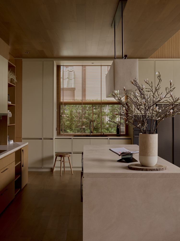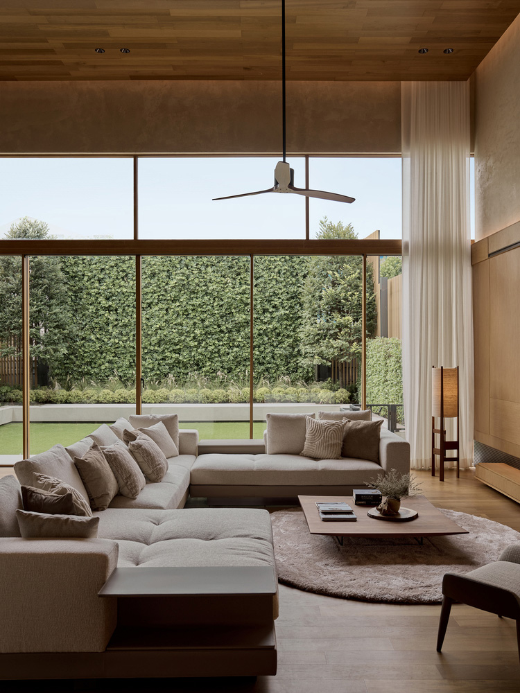 室内,家的核心展开为一个双高的生活空间,由落地窗环绕,直接连接到郁郁葱葱的后院。这个中央区域作为一个社交和视觉的焦点,增强了空间的清晰度,并在室内和景观之间创造了宁静的连续性。柔和的触感饰面——纹理墙面、木质天花板和暖色调的家具——进一步支持了这种毫不费力的舒适和优雅的氛围。
